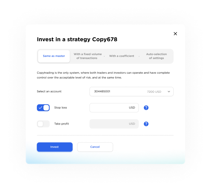 Hemos recopilado posibilidades únicas de personalización de copiado de trading. Encuentre la combinación perfecta de configuraciones para adaptarse a su estilo de negociación.