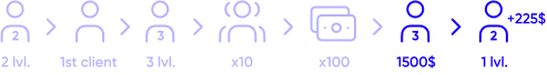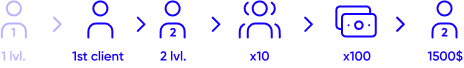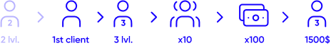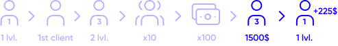 El primer cliente del socio del segundo nivel se convirtió en socio (nivel 3), y para el primer socio ya es el tercer nivel. El socio también atrajo a 10 clientes. En total, los clientes