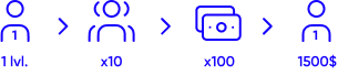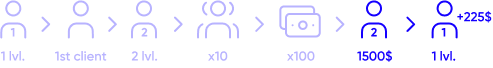 El socio (nivel 1) se registró y comenzó a atraer clientes. Atrajo a 10 clientes. En total, los clientes colocaron 100 lotes. De acuerdo con las condiciones para este socio, recibió comisión de $ 15 por cada lote.
